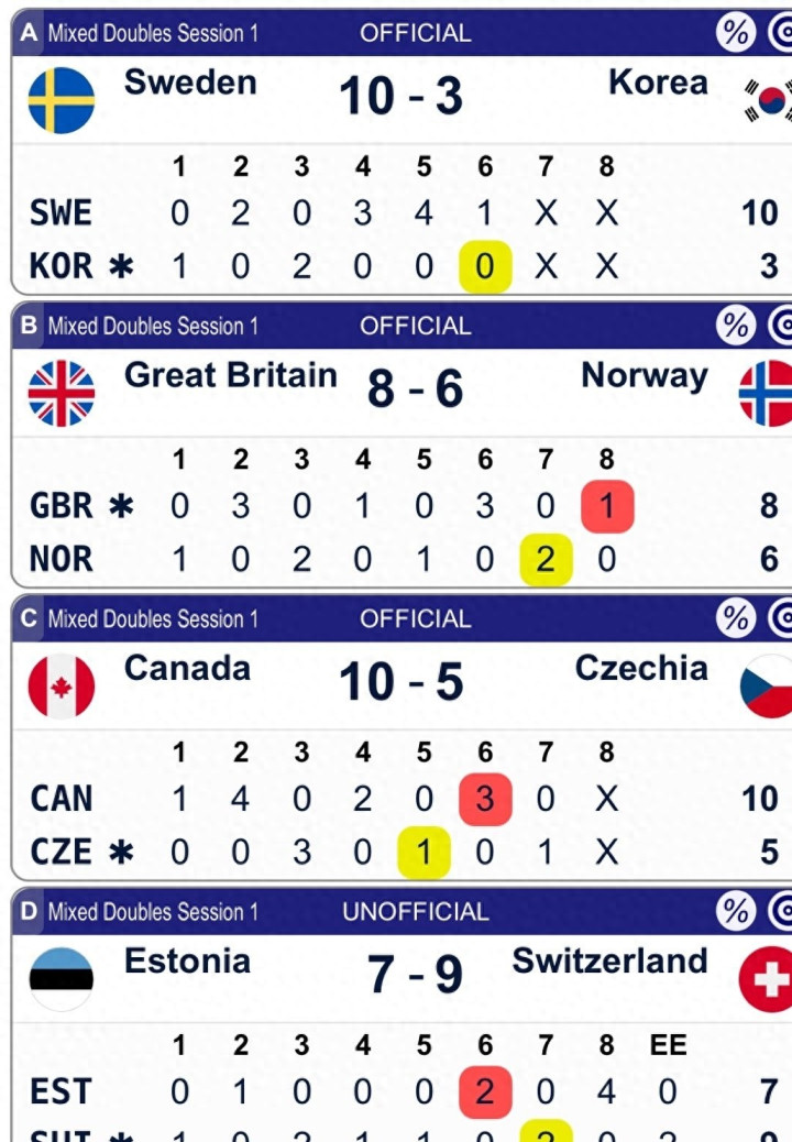 另外几场比赛,英国8:6挪威,加拿大10:5捷克,瑞士9:7爱沙尼亚。东道主意大利与美国队本轮轮空。